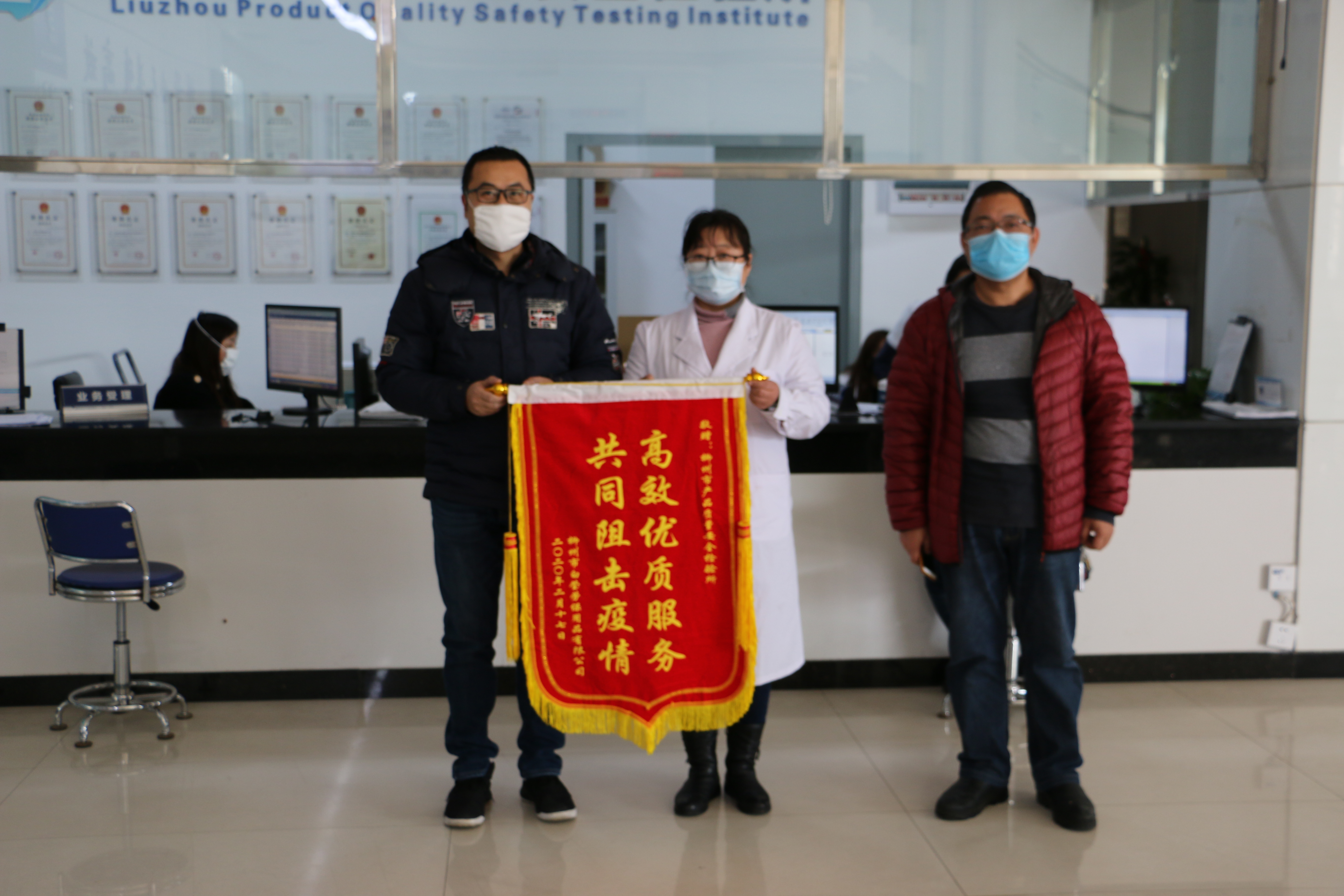 2月18日,柳州市白莹劳保用品有限公司来到柳州市产品质量安全检验所,送上一面写着“高效优质服务,共同阻击疫情”的锦旗,感谢市质检所在疫情防控关键期间,担当作为,为企业在应急口罩正产提供了高效优质的服务。